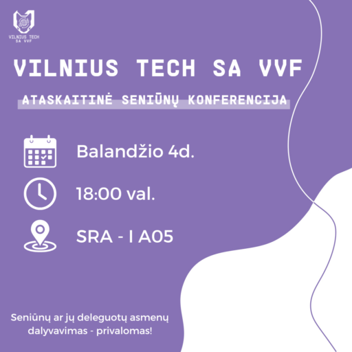Kviečiame visus į VILNIUS TECH SA VVF ataskaitinę seniūnų konferenciją, kuri vyks balandžio 4 dieną, 18 valandą, SRA – I A05 auditorijoje.