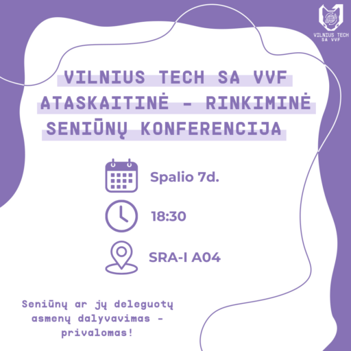 Spalio 7 dieną, 18:30 kviečiame visus į VILNIUS TECH SA VVF eilinę ataskaitinę – rinkiminę seniūnų konferenciją, kuri vyks SRA-I A04, o jos metu savo veiklos ataskaitą pristatys VILNIUS TECH SA VVF pirmininkė Viltė Jakštaitė. Taip pat bus renkamas naujas VILNIUS TECH SA VVF pirmininkas.