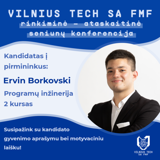 Šios konferencijos metu bus renkamas naujas VILNIUS TECH SA FMF pirmininkas. Šį kartą turime tik vieną kandidatą į pirmininko postą — Programų inžinerijos antrojo kurso studentą Ervin Borkovski. Kviečiame susipažinti su kandidato gyvenimo aprašymu, bei motyvaciniu laišku.